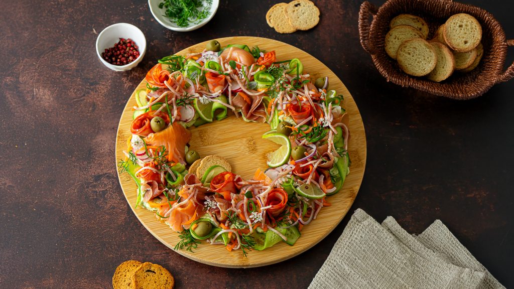 Ingredientes: 2 limas2 abacates maduros200g de queijo creme1/2 cebola roxa, cortada em meias-luas finas1 cenoura pequena3 pepinos baby5 rabanetes50g de Salmão Fumado50g de Presunto Fatiado 50g de Chourição Fatiado50g de Fios de BaconAzeiteSal e Pimenta preta moída Para decorarErvas frescas (coentros, tomilho ou outras a gosto)Azeitonas verdesCrackers ou pão crocante para servir Serve: 6 a 8 […]