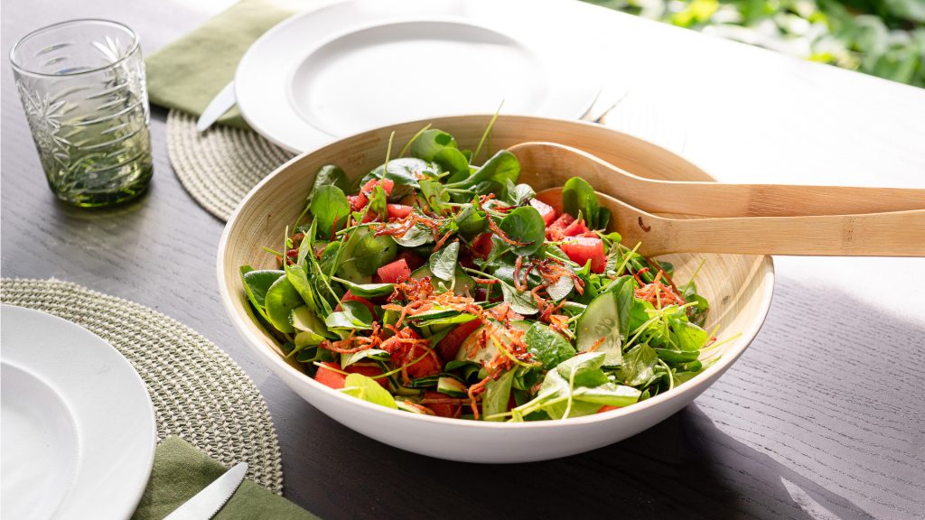 Ingredientes: 150g de agrião baby3 fatias de melancia1 pepino100g de Fios de Bacon1 mão cheia de folhas de hortelã fresca1/2 sumo de limão1 fio de azeite virgem extraPimenta preta moídaFlor de sal Serve: 4 pessoas Grau de dificuldade: Fácil Tempo médio total: 15 minutos Bom Apetite! Passo 1: Tostar o bacon numa frigideira antiaderente, sem […]
