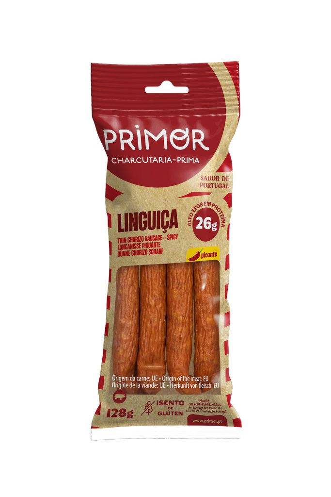 Produtos Embalagem com 128g 25,6 g proteína /128g de produto Alegações: Alto teor de proteína; Fonte de proteína; Baixo teor de açúcares; Isento de glúten; Ingredientes: Carne e gordura de suíno (origem: UE), água, sal, antioxidantes (lactato de potássio e eritorbato de sódio), pimento, dextrose, alho, especiarias, 0,15% piripiri, extrato de pimentão, hemoglobina, conservante (nitrito […]