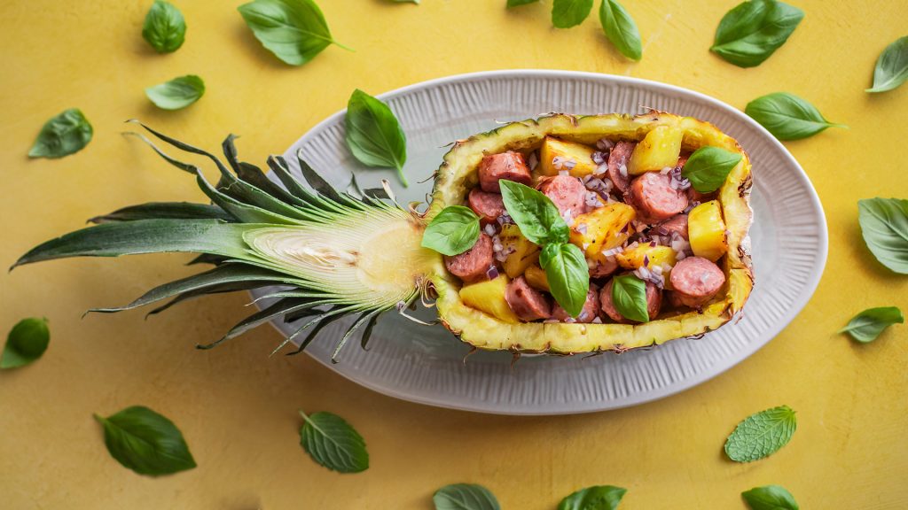 Ingredientes: 1 emb. de Salsichas de Churrasco1/2 abacaxi1/4 de cebola roxa picadaFolhinhas de manjericãoAzeite qb. Serve: 4 pessoas Grau de dificuldade: Fácil Tempo médio total: 25 minutos Bom Apetite! Passo 1: Grelhar os cubos de abacaxi num grelhador pincelado com azeite, até dourarem e começarem a caramelizar. Passo 2: Grelhar as salsichas e cortar em rodelas. […]